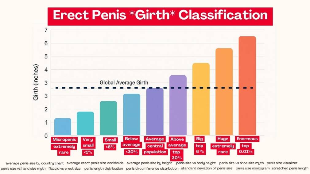 Ці категорії засновані на стандартному відхиленні розміру пеніса з глобальних досліджень, а це означає, що переважна більшість людей підпадають під середні або трохи вище/нижче середні діапазони. На відміну від загальних вірувань, насправді великі розміри пеніса (7 дюймів або більше) є статистично рідкісними, представляючи лише незначну частину глобальної популяції. Це пояснює, чому соціальне сприйняття часто перебільшує, чим насправді є “великий”.