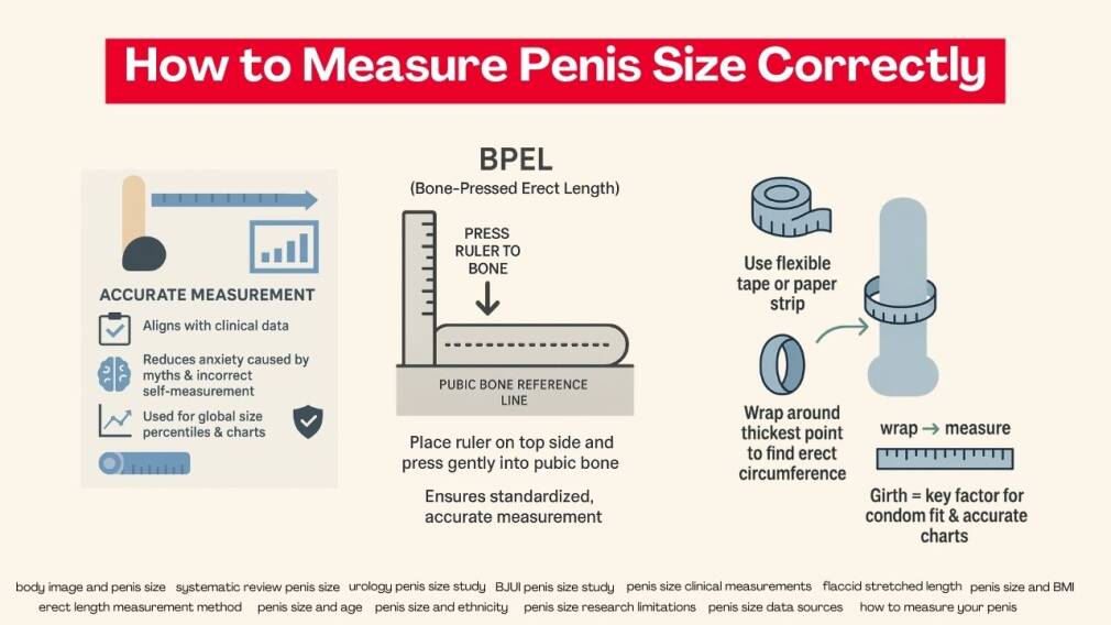 Точне вимірювання вашого розміру є єдиним надійним способом зрозуміти ваше положення на таблиці розмірів пеніса або в глобальному розподілі розмірів пеніса. Оскільки багато непорозумінь походить від неправильних методів, спеціалісти рекомендують використовувати стандартизовані клінічні техніки, а не підходи, засновані на саморепортах. Правильне вимірювання допомагає визначити вашу дійсну середню довжину пеніса, середню окружність пеніса та загальне положення в відсоткових частках розмірів пеніса. Воно також допомагає зменшити тривогу щодо розмірів пеніса, особливо для осіб, які задаються питанням: «Чи є у мене нормальний розмір пеніса?» або порівнюють себе за допомогою інструментів візуалізації розмірів пеніса онлайн.
