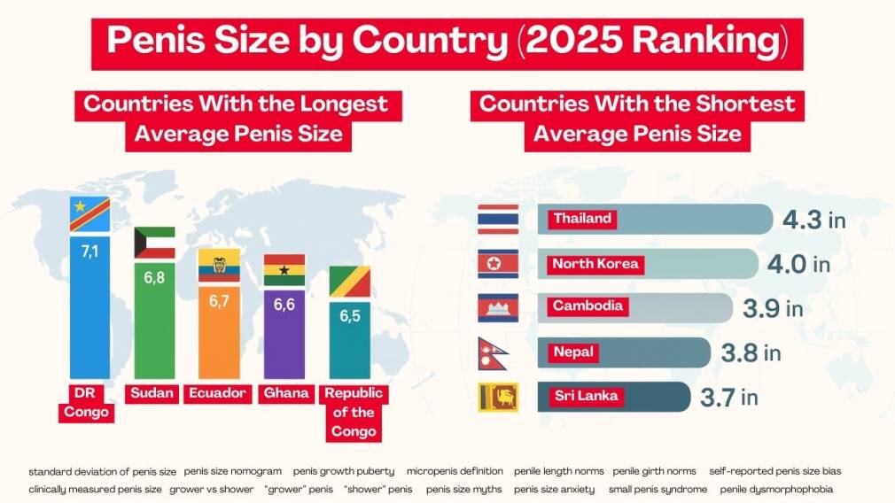 Світові дослідження показують, що розмір пеніса у всьому світі дещо варіює за регіонами, але люди залишаються надзвичайно зацікавленими в міжнародних порівняннях. Сучасні дослідження — особливо ті, що ґрунтуються на клінічно виміряних даних, а не на самозвітних опитуваннях — дозволяють нам створити реалістичний і точний розподіл розмірів пеніса по країнах для 2025 року, допомагаючи читачам зрозуміти, як національні середні значення порівнюються всередині глобальних розподілів розмірів пеніса. Ці рейтинги можуть бути цікавими, але їх завжди слід інтерпретувати з обережністю, оскільки методи збору сильно відрізняються.